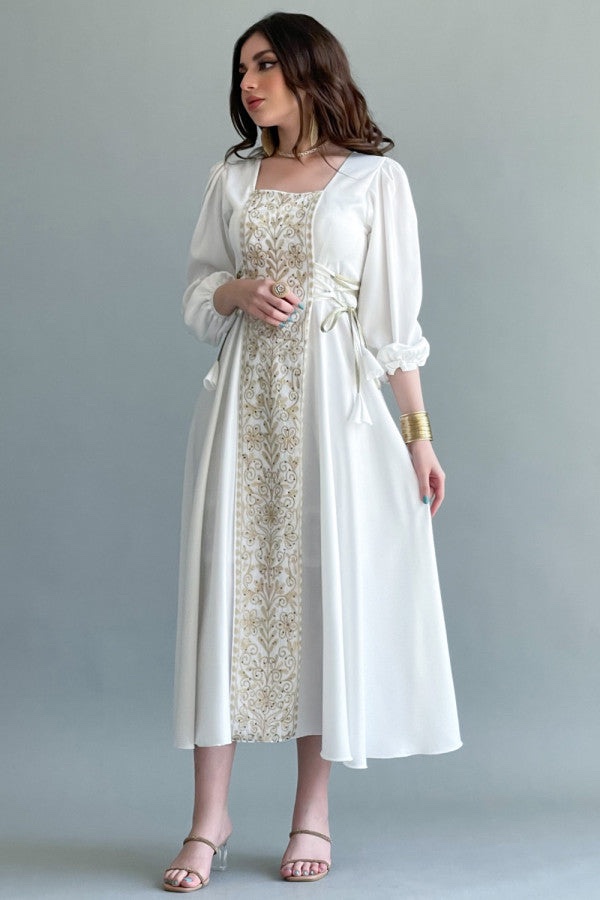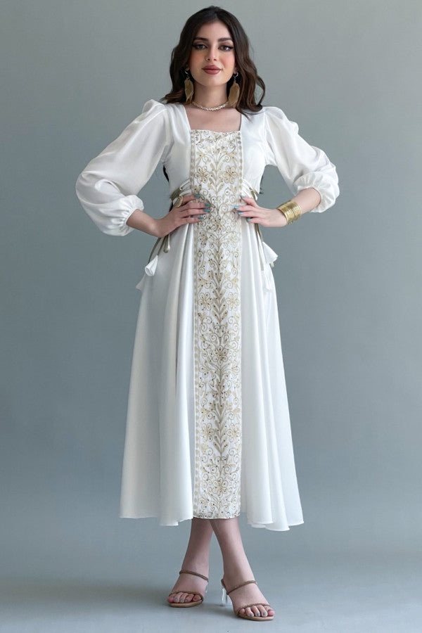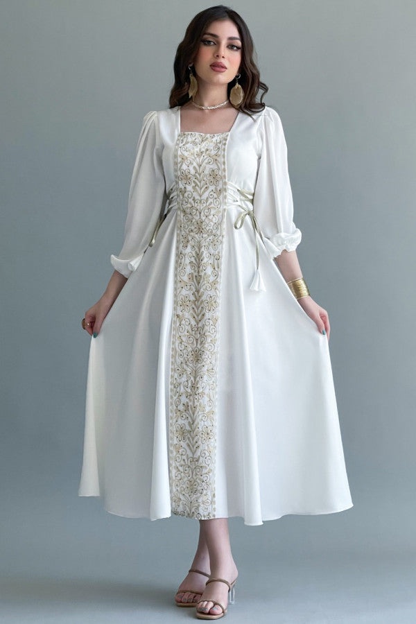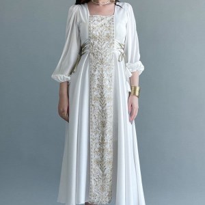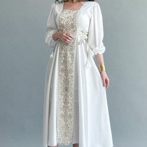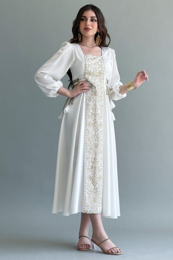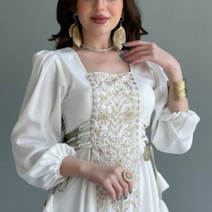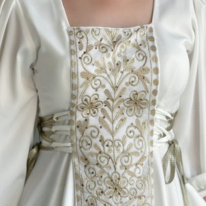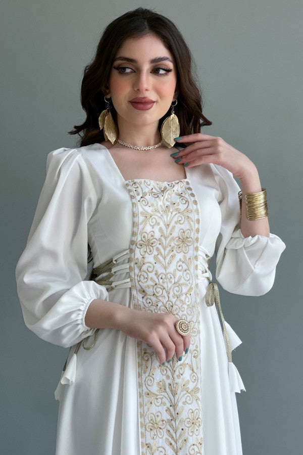 جلابية لون ابيض مع ذهبي . القماش حرير