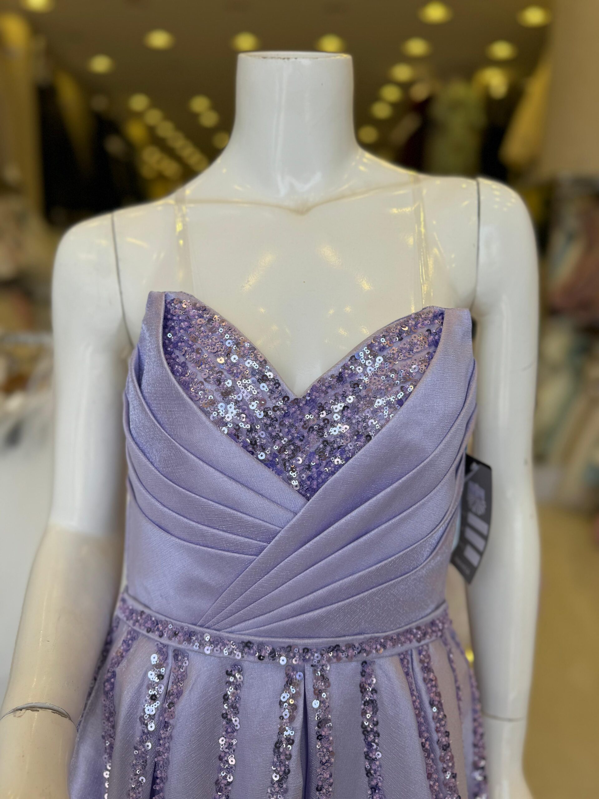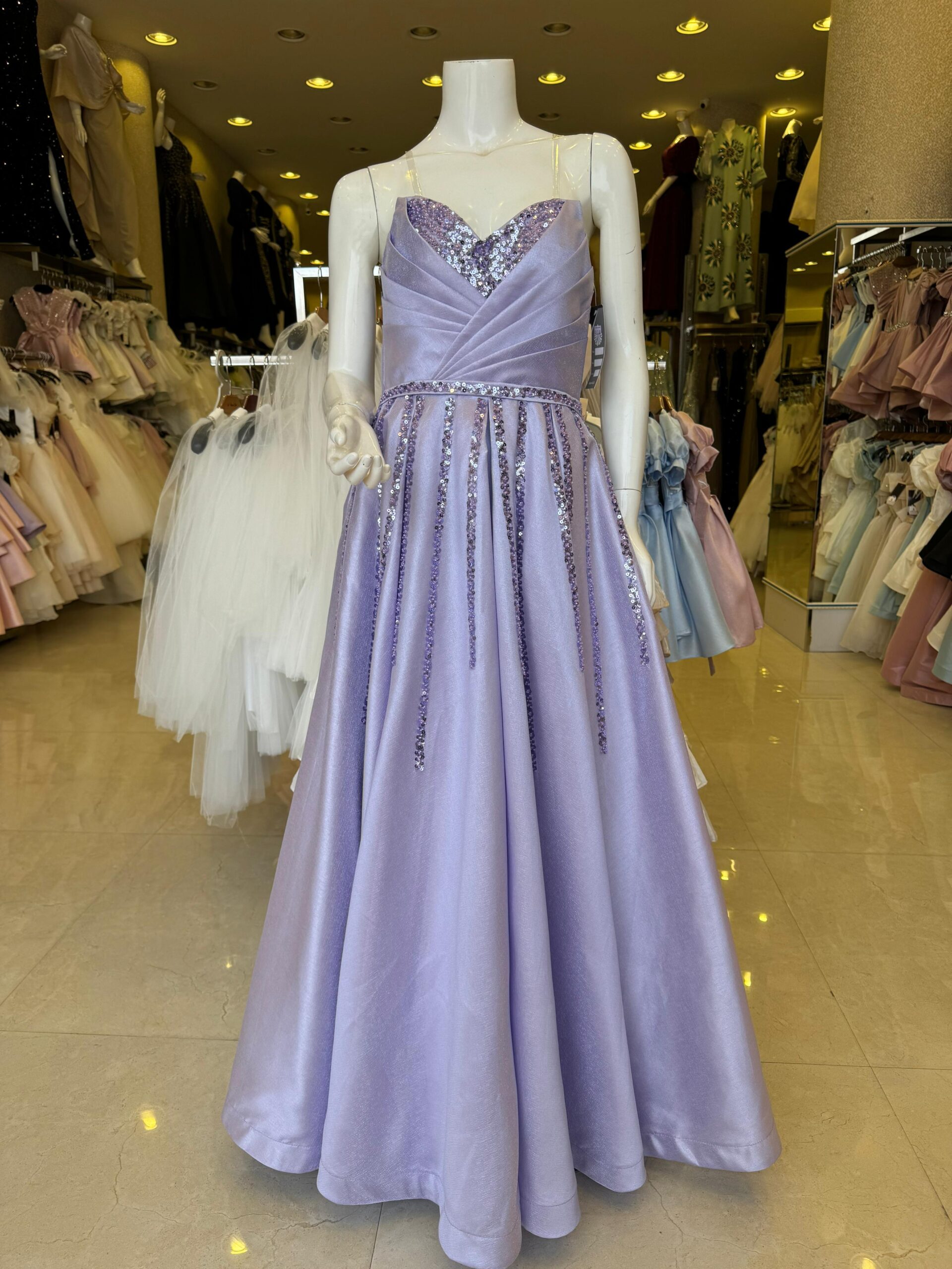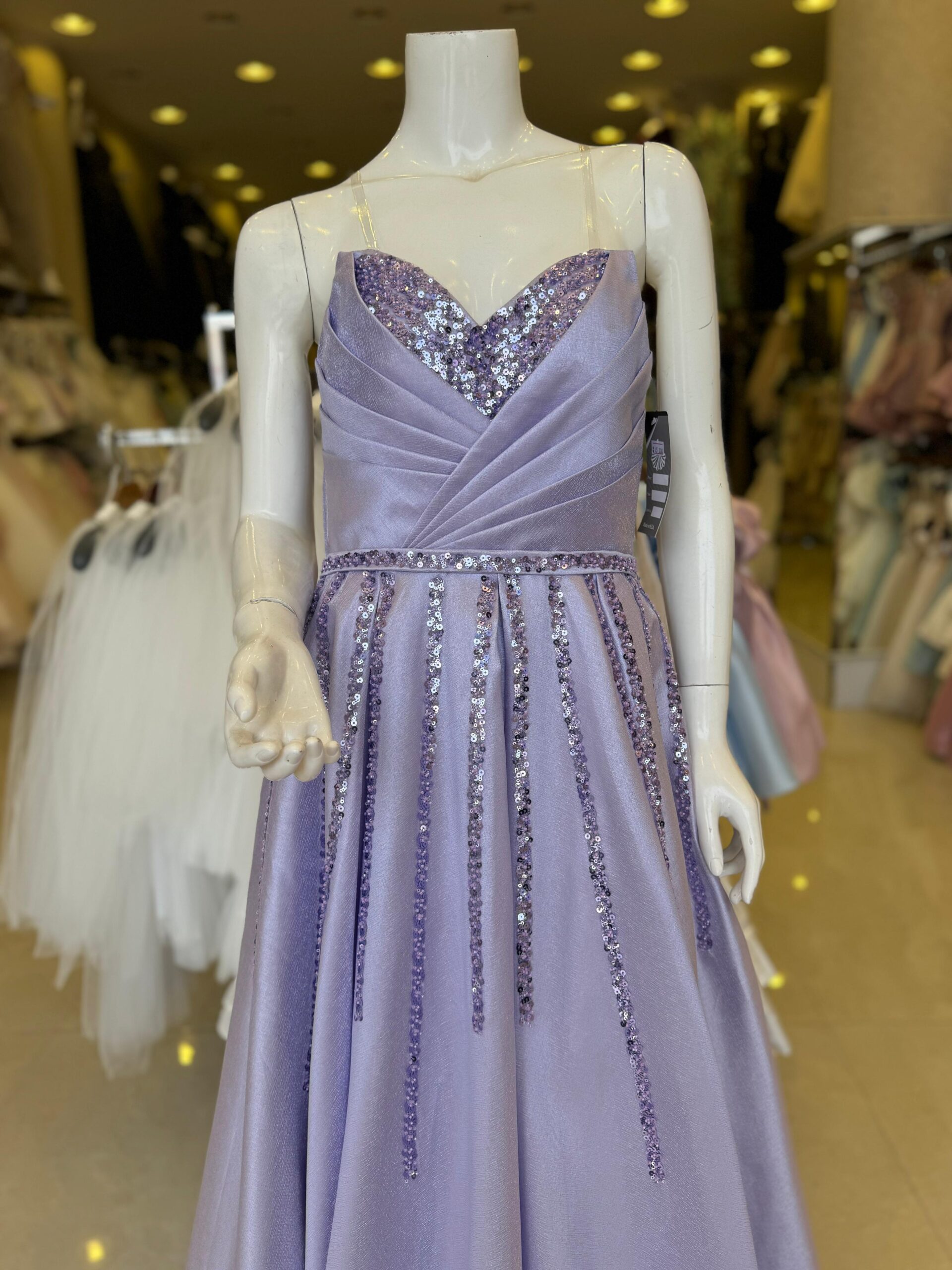 فستان السهرة باللون البنفسجي وتصميم صدرية ترتر يمكن أن يكون إطلالة ساحرة ومميزة. يمكن تنسيقه مع المجوهرات اللامعة والإكسسوارات الأنيقة وحذاء مناسب لإكمال الإطلالة الأنيقة التي تلفت الأنظار